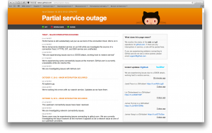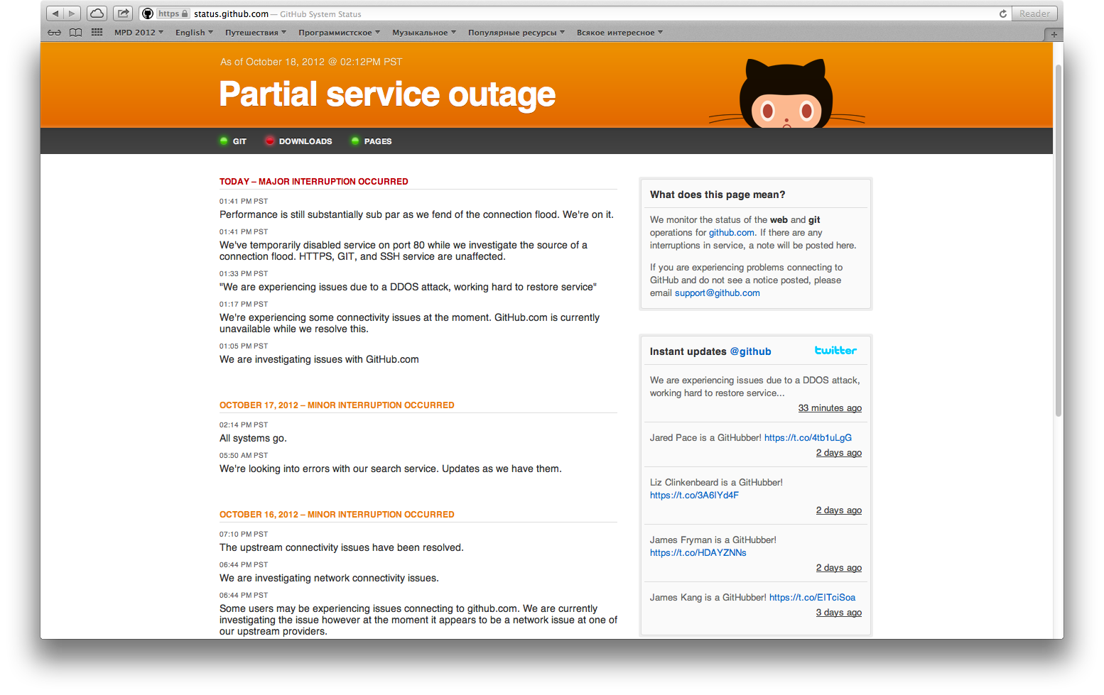 Github вчера внезапно упал на полтора часа. Ну не совсем внезапно - благодаря DDoS атаке. В этот момент я как раз собирался пушить и тут... Даже успел скриншот снять после востановления.